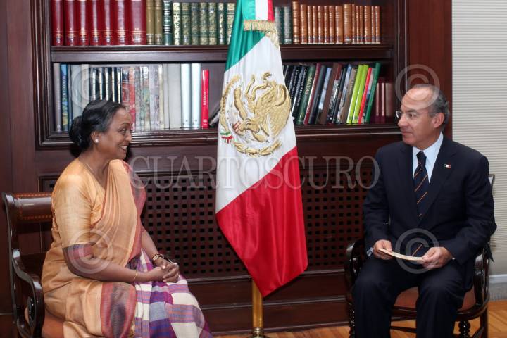 MÉXICO, D.F., 14ABRIL2011.- Meira Kumar, presidenta de la Cámara Baja del Parlamento de la República de la India y Felipe Calderón Hinojosa, presidente de México, se reunieron esta tarde en la residencia oficial de Los Pinos. FOTO: ALFREDO GUERRERO/CUARTOSCURO.COM
