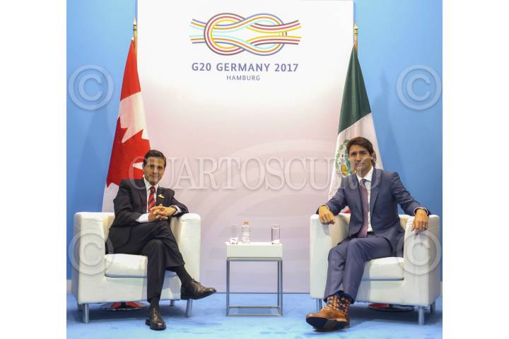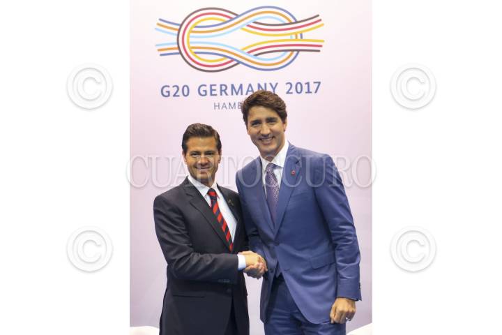HAMBURGO, ALEMANIA, 08JULIO2017.- El Presidente Enrique Peña Nieto, sostuvo hoy una reunión con el Primer Ministro de Canadá, Justin Trudeau, durante las actividades que se llevaron a cabo en la Cumbre de Líderes del G20. En el encuentro, el Mandatario mexicano invitó al Primer Ministro canadiense a realizar una visita a México. FOTO: PRESIDENCIA /CUARTOSCURO.COM