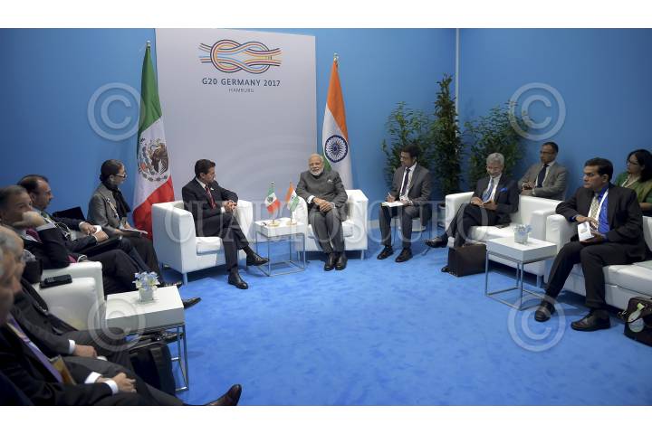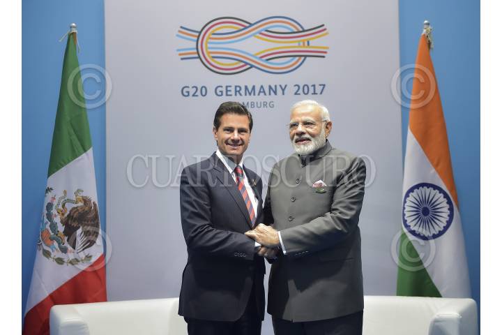 HAMBURGO, ALEMANIA, 08JULIO2017.- En el marco de su participación en la Cumbre de Líderes del Grupo de los 20 (G20), que se celebra en esta ciudad, el Primer Mandatario mexicano, Enrique Peña Nieto, sostuvo hoy una reunión con Narendra Modi, Primer Ministro de la India. FOTO: PRESIDENCIA /CUARTOSCURO.COM