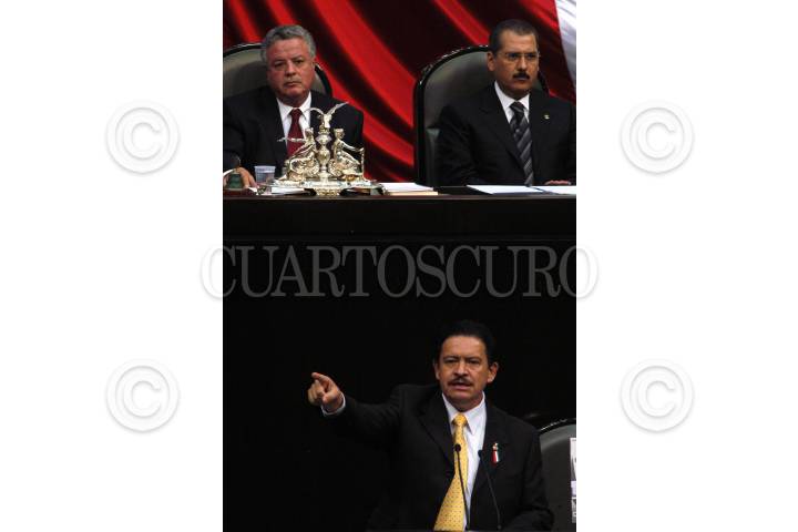 MÉXICO, D.F. 01SEPTIEMBRE2006.- El diputado perredista Carlos Navarrete durante su discurso previo al sexto informe de gobierno del presidente Vicente Fox en la Cámara de Diputados. En la parte superior Jorge Zermeño (PAN) y Manlio Fabio Beltrones (PRI). FOTO: Iván Stephens/CUARTOSCURO.COM