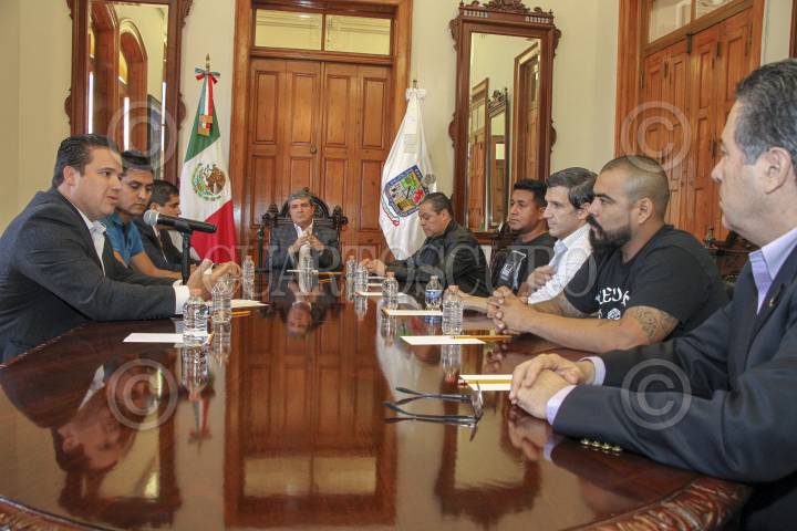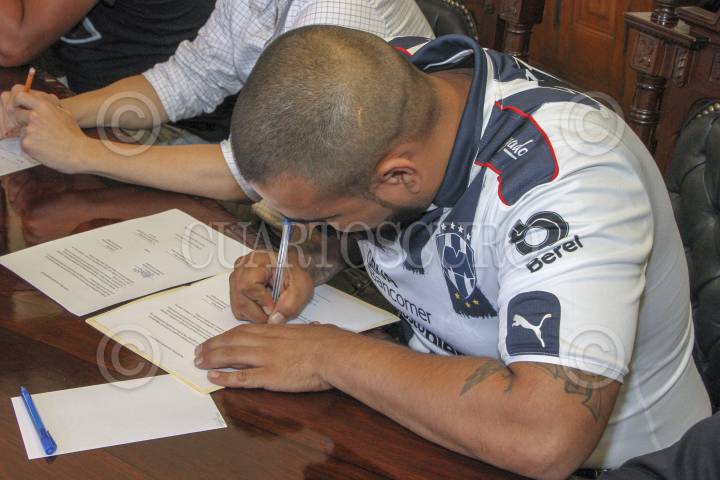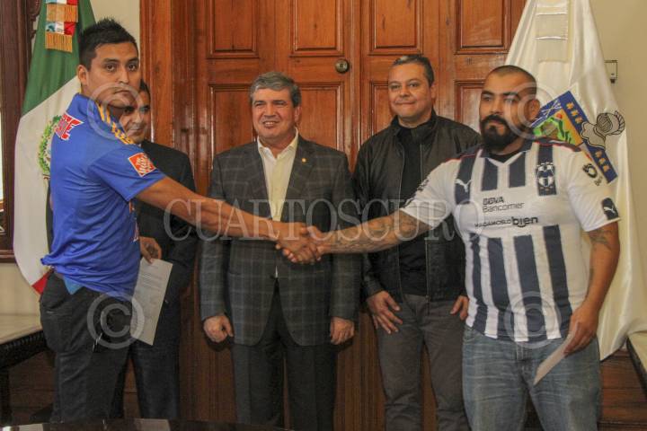 MONTERREY, NUEVO LEÓN, 02OCTUBRE2018.- En una reunión privada Gobierno de Estado, así como las directivas de Rayados y Tigres, firman como testigos de pacto contra la violencia entre “La Adicción” y “Libres y Lokos”. Por instrucciones del Gobernador Jaime Rodríguez Calderón, el Secretario General de Gobierno, Manuel González Flores recibió en su despacho a Tonatiuh Mejía, Vicepresidente de Administración del Club de Futbol Monterrey; y a Alberto Palomino, director de Operaciones del club Tigres. Además, acudieron el representante del grupo “La Adicción”, Iván Villarreal; y Samuel Reyes, líder de “Libres y Lokos”, luego de que el Gobierno impulsara el acuerdo entre ambos grupos y las directivas. Esta reunión se llevó a cabo con el fin de evitar un nuevo conflicto entre ambos grupos, como el acontecido hace casi dos semanas, previo al Clásico 117 del fútbol regiomontano. FOTO: CUARTOSCURO.COM