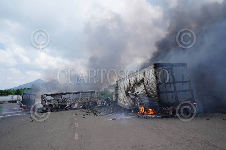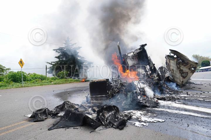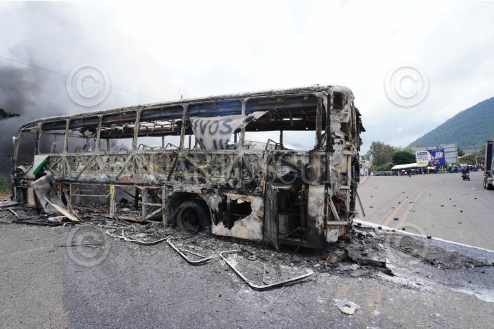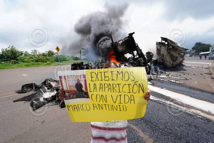 TANGAMANDAPIO, MICHOACÁN. 22AGOSTO2024. A 48 horas de que desaparecieron siete policías comunales en La Cantera, comunidad indígena perteneciente a Tangamandapio, se han registrado al menos cinco vehículos incendiados por comuneros, quienes exigen se agilice la búsqueda de sus compañeros. Durante este jueves 22 de agosto han sido incendiados por lo menos tres vehículos por los pobladores de La Cantera, el primero de ellos fue un autobús de pasajeros, después un camión de carga y el último una camioneta tipo van de una empresa repartidora. Sobre los comuneros se sabe que desaparecieron el pasado martes 20 de agosto tras recibir un llamado de auxilio por parte de su comandante, sin embargo, desde esa fecha no se sabe nada de ellos por lo que sus compañeros comenzaron una serie de bloqueos en la carretera Jacona - Los Reyes. FOTO: JUAN JOSÉ ESTRADA SERAFÍN /CUARTOSCURO.COM