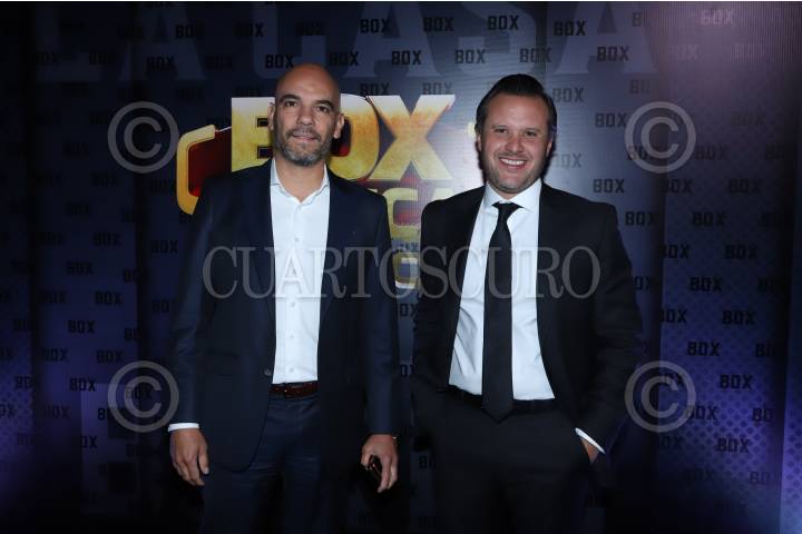 Rodolfo Ramírez Márquez, director de Azteca Deportes y Rafael Rodríguez, Director General de TV Azteca durante la alfombra roja por el 15 aniversario de Box Azteca, La casa del boxeo