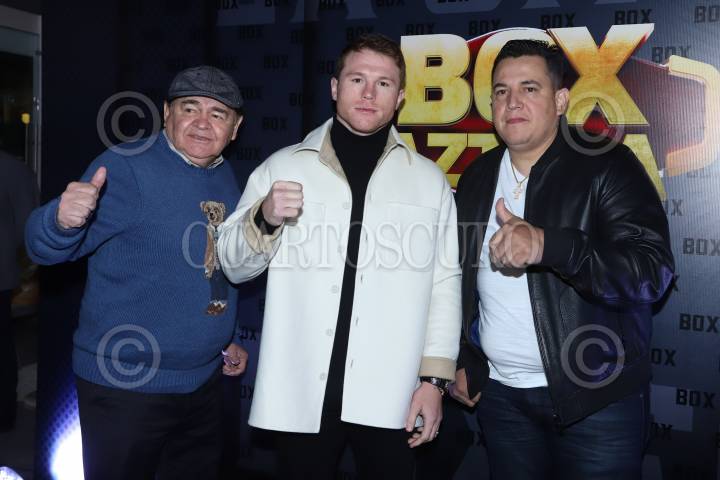 Chepo Reynoso, Saúl “El Canelo” Álvarez, Eddy Reynoso, durante la alfombra roja por el 15 aniversario de Box Azteca, La casa del boxeo