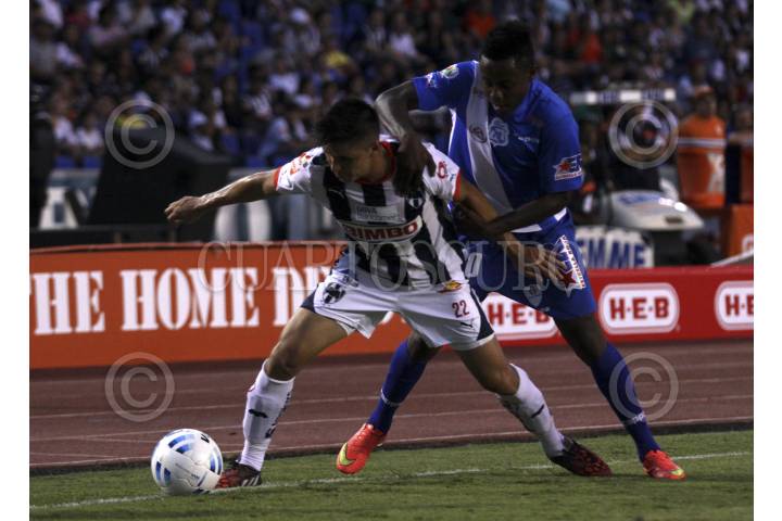 MONTERREY, NUEVO LEÓN, 23AGOSTO2014.- Jesús Zavala del equipo de los Rayados en una jugada contra Mauricio Romero del equipo del Puebla, en el estadio tecnológico, partido correspondiente a la jornada 6 de la Apertura 2014 de la Liga MX. FOTO: GABRIELA PÉREZ MONTIEL /CUARTOSCURO.COM