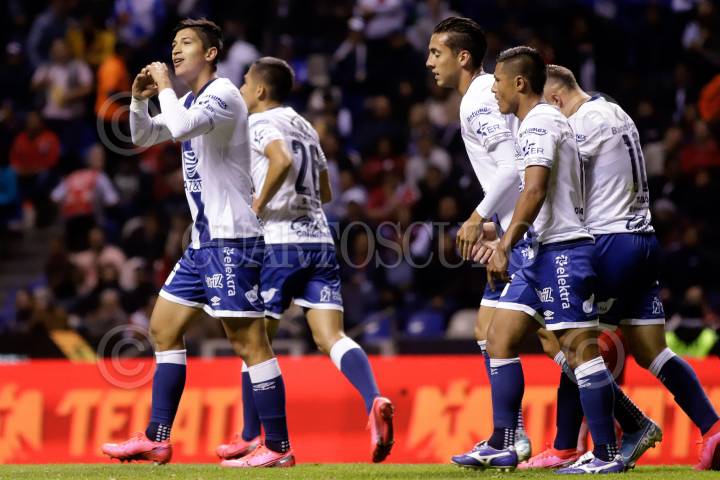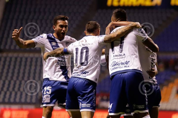 Jugadores del Club Puebla en festejo de gol durante el partido de la jornada 7 del torneo Clausura 2020 de la Liga BBVA MX, entre el Club Puebla y los Diablos Rojos del Toluca