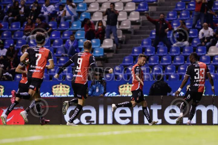 Jugadores en festejo de gol durante el partido entre el Club Puebla y los Rojinegros del Atlas correspondiente a la jornada 12 del torneo Clausura 2023 de la Liga BBVA MX, celebrado en el estadio Cuauhtémoc.
