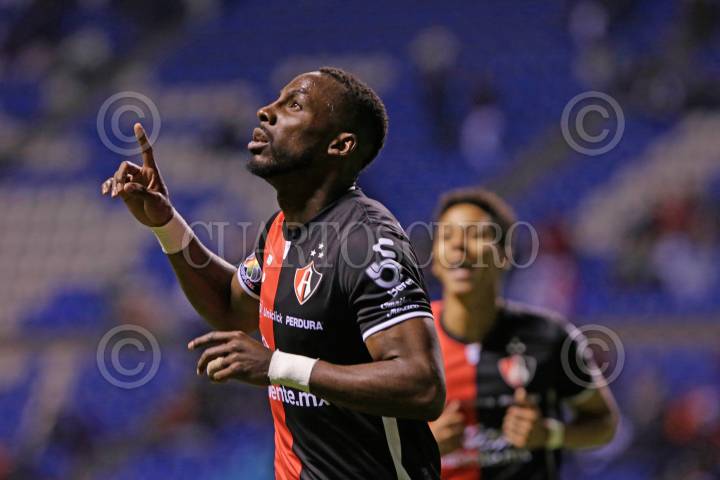 Julián Quiñones en festejo de gol durante el partido entre el Club Puebla y los Rojinegros del Atlas correspondiente a la jornada 12 del torneo Clausura 2023 de la Liga BBVA MX, celebrado en el estadio Cuauhtémoc.