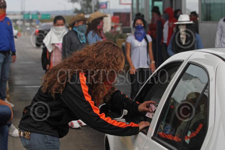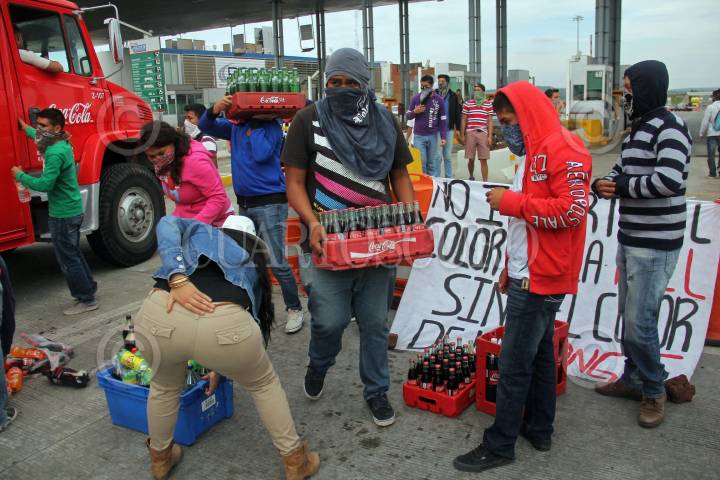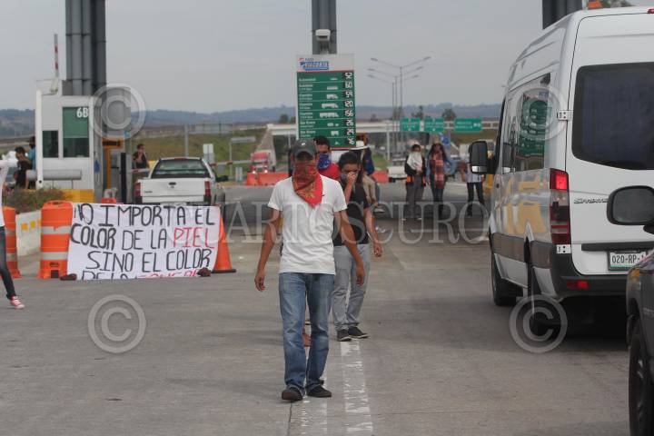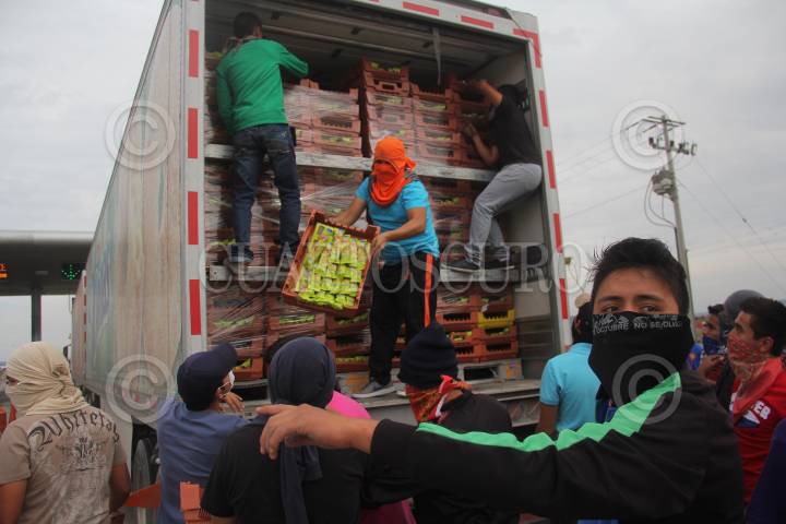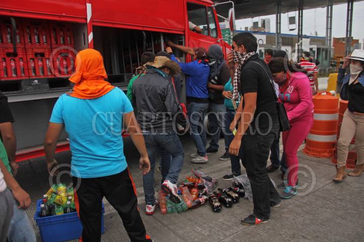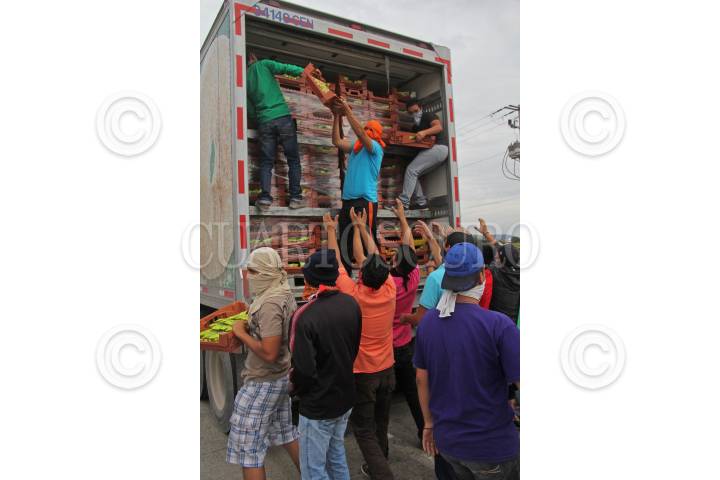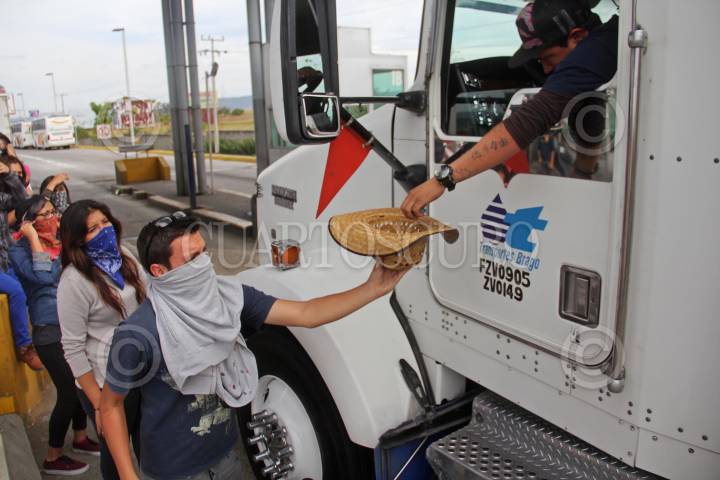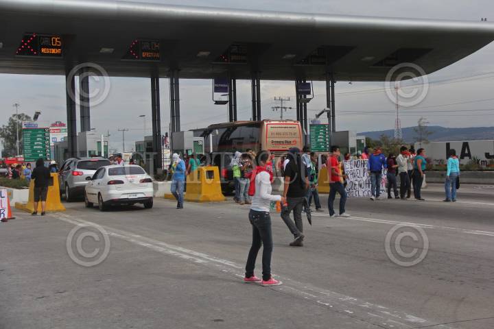 ZAPOTLANEJO, JALISCO, 19NOVIEMBRE2014.- Estudiantes de la Normal de Atequiza tomaron la caseta de cobro La Joya de la carretera a Zapotlanejo, lugar en donde permanecieron algunas horas dando paso a los automovilistas así como a transportistas por solo una aportación voluntaria como peaje, también saquearon con consentimiento a un par de transportistas de algunas marcas comerciales, esto en apoyo y solidaridad de los Normalistas desaparecidos de Ayotzinapa Guerrero. FOTO: FERNANDO CARRANZA GARCIA / CUARTOSCURO.COM