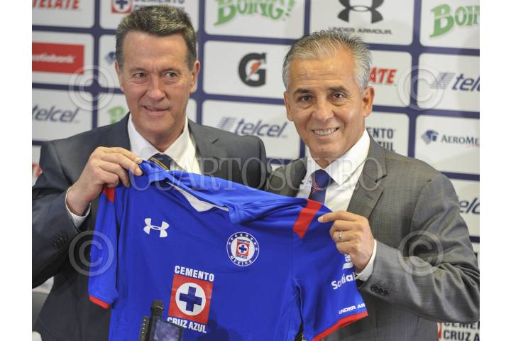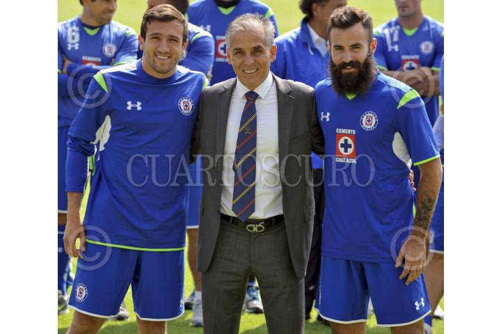 MÉXICO, D.F., 08JUNIO2015.- Jerónimo Amione, Sergio Bueno, actual entrenador del Club Cruz Azul, y Marc Crosas, ambos refuerzos fueron presentados de cara al Torneo Apertura 2015 en el Campo de Entrenamiento del Club ubicado al sur de la ciudad. FOTO: GABINO ACEVEDO / CUARTOSCURO.COM
