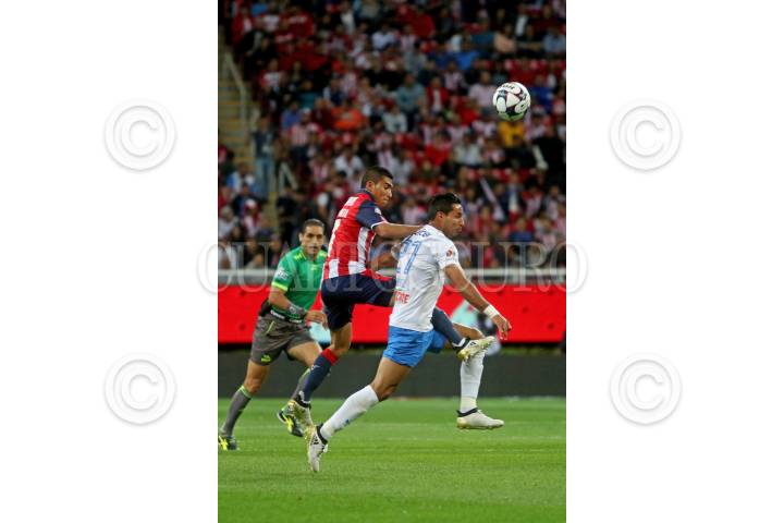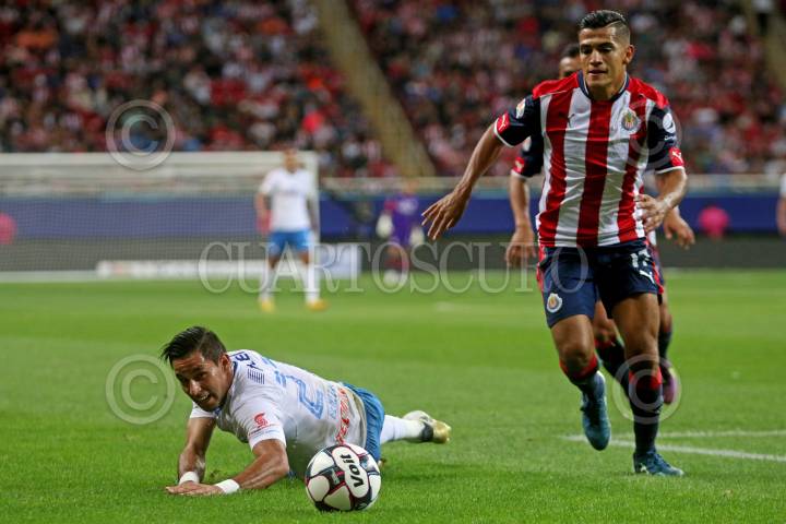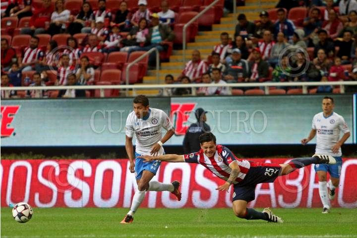 ZAPOPAN, JALISCO. 29OCTUBRE2016.- Jesús Sánchez, jugador de Chivas disputa un balón a Jorge Benítez de Cruz Azul, en partido correspondiente a la Jornada 15 del Torneo Apertura 2016 de la Liga MX, en donde se enfrentan las Chivas de Guadalajara frente a la Maquina de Cruz Azul, en encuentro que se lleva a cabo en el Estadio Chivas. FOTO : FERNANDO CARRANZA GARCIA / CUARTOSCURO.COM