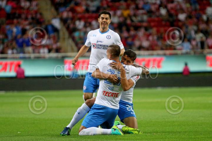 ZAPOPAN, JALISCO. 29OCTUBRE2016.- Richard Ruiz, jugador de Cruz Azul celebra su anotación con sus copañeros, en partido correspondiente a la Jornada 15 del Torneo Apertura 2016 de la Liga MX, en donde se enfrentan las Chivas de Guadalajara frente a la Maquina de Cruz Azul, en encuentro que se lleva a cabo en el Estadio Chivas, hasta el momento el marcador se encuentra igualado a dos goles. FOTO : FERNANDO CARRANZA GARCIA / CUARTOSCURO.COM