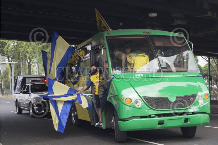 CIUDAD DE MÉXICO, 14SEPTIEMBRE2019.- Integrantes de la barra brava "La Rebel", grupo de animación del Club Universidad, en su llegada al Estadio Azteca. Partiendo del Estadio Olímpico Universitario en camiones y microbuses, los aficionados auriazules fueron escoltados por un operativo amplio de Policía de la Ciudad de México. FOTO: PEDRO ANZA /CUARTOSCURO.COM