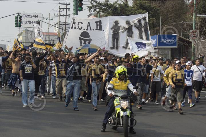 MÉXICO, DF., 22FEBRERO2014.- Esta tarde se enfrentan los universitarios Pumas contra las Águilas del América en el Estadio Azteca. Integrantes de la porrra "La Monumental" arribaron en camiones de transporte público hasta las faldas del estadio FOTO: MARÍA JOSÉ MARTÍNEZ /CUARTOSCURO.COM