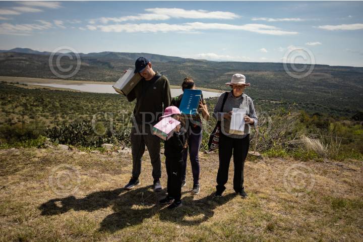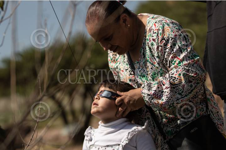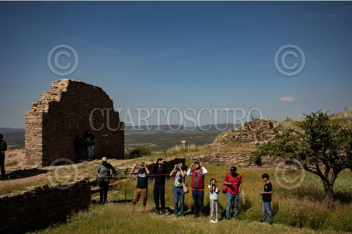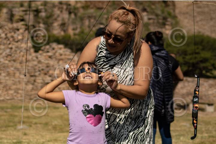 VILLANUEVA, ZACATECAS, 14OCTUBRE2023.- Cientos de zacatecanos se dieron cita en la zona arqueológica de La Quemada, a 70 kilómetros de la capital zacatecana; para visitar el sitio y poder observar el eclipse solar anular, que en la mayoría del territorio zacatecano se pudo observar en un 70?bloqueo del sol por parte de la luna. Personal del Instituto Nacional de Antropología e Historia delegación Zacatecas ofreció lentes para que las personas pudieran observar con cuidado el fenómeno astronómico. FOTO: ADOLFO VLADIMIR /CUARTOSCURO.COM