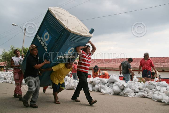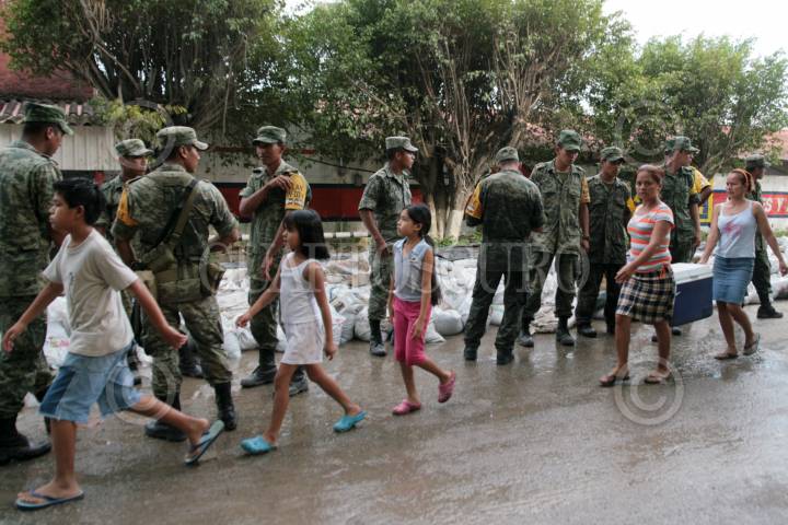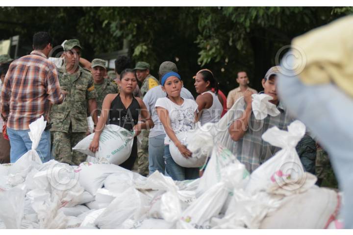 VILLAHERMOSA, TABASCO, 06OCTUBRE2010.- Mujeres, hombres y cuerpo castrense apuran en la colocación de costales con arena para tratar de evitar que las aguas del río Carrizal penetren en zona seca tras colapsar un muro de contención en la ranchería Emiliano Zapata. FOTO: MARCO POLO GUZMÁN HERNÁNDEZ/CUARTOSCURO.COM