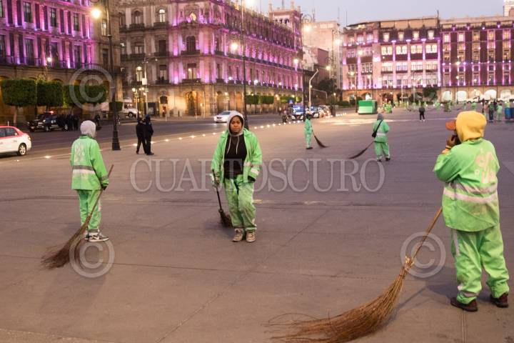 Desde temprano trabajadoras de la ciudad comernzaron a despintar y limpiar el zócalo tras la marcha del día de ayer