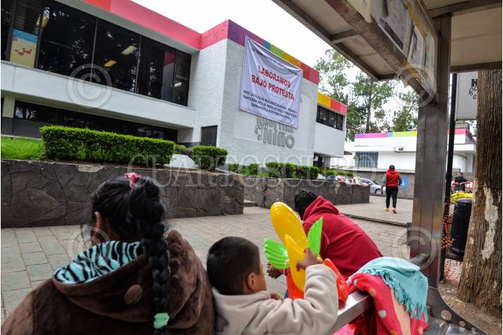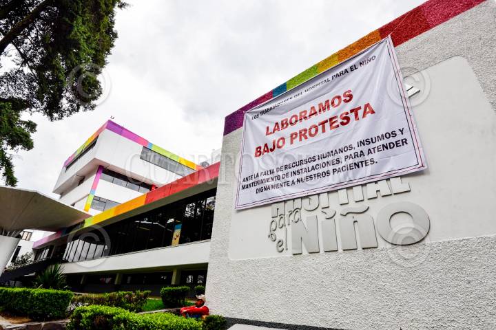 TOLUCA, ESTADO DE MÉXICO, 12JUNIO2018.- En la fachada del Hospital para el Niño fue instalada una manta por trabajadores del mismo en donde informan a la población que se encuentran “Laborando bajo Protesta” ante la falta de insumos, recursos humanos y falta de mantenimiento de las instalaciones. FOTO: ARTEMIO GUERRA BAZ /CUARTOSCURO.COM