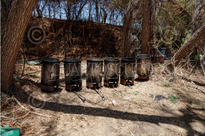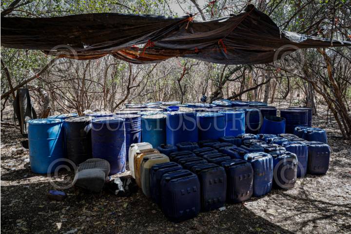 CULIACÁN, SINALOA, 19JUNIO2025.- Barriles con residuos de sustancias químicas fueron localizados por el Ejército Mexicano en un laboratorio clandestino ubicado en San Miguel de las Mesas, en la sierra de Culiacán. Los recipientes formaban parte del equipo utilizado para la elaboración de metanfetaminas. FOTO: JOSÉ BETANZOS ZÁRATE/CUARTOSCURO.COM