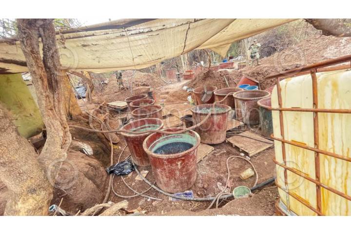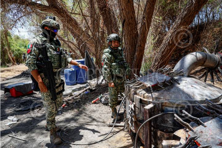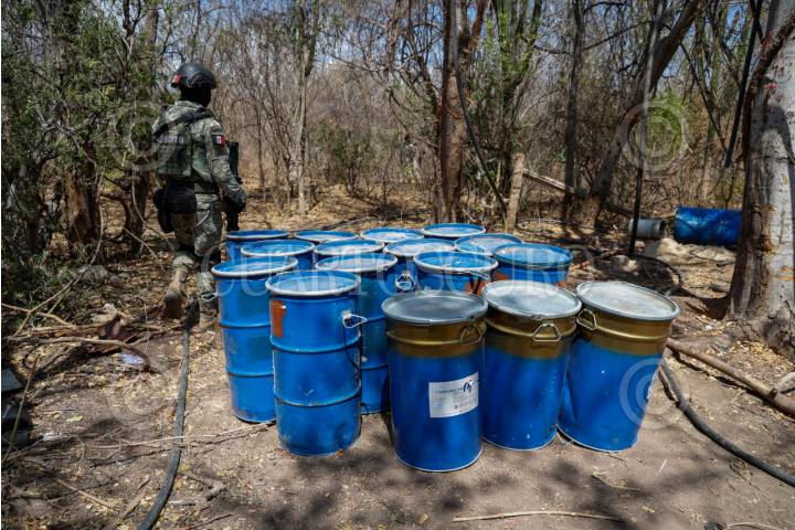 CULIACÁN, SINALOA, 19JUNIO2025.- Elementos del Ejército Mexicano aseguraron un laboratorio fijo y otro móvil para la elaboración de metanfetaminas, localizados en la zona serrana de Culiacán, en los límites con el municipio de Cosalá. De acuerdo con información de la Novena Zona Militar, las instalaciones tenían capacidad para producir hasta una tonelada diaria de cristal. Durante un recorrido, se informó que ambos espacios operaban hasta días antes de su localización. En el primer punto, entre La Bebelama de San Lorenzo y Tabalá, en la zona de El Salado, se hallaron restos del laboratorio fijo; mientras que en San Miguel de las Mesas, a seis kilómetros al sur, fueron encontrados contenedores con sustancias como tolueno, ácido clorhídrico, alcohol etílico, acetona y acetato de plomo, almacenadas a la intemperie. FOTO: JOSÉ BETANZOS ZÁRATE/CUARTOSCURO.COM