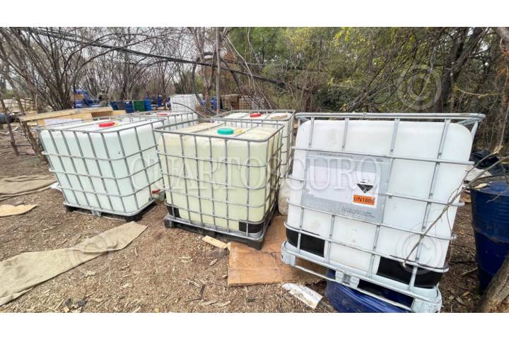 CULIACÁN, SINALOA, 19JUNIO2025.- Contenedores con sustancias químicas como tolueno, ácido clorhídrico, alcohol etílico, acetona y acetato de plomo fueron localizados a la intemperie por elementos del Ejército Mexicano en un laboratorio clandestino en San Miguel de las Mesas, en la sierra de Culiacán. El hallazgo se realizó durante un operativo de reconocimiento en la zona. FOTO: JOSÉ BETANZOS ZÁRATE/CUARTOSCURO.COM