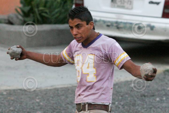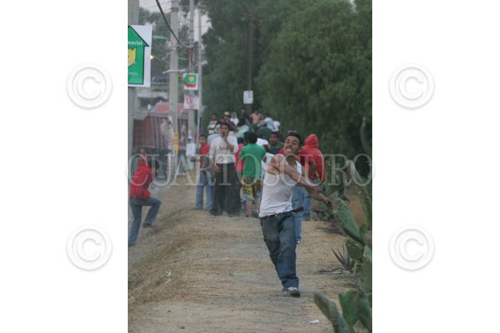 IXTAPALUCA, ESTADO DE MÉXICO, 09MARZO2011.- Un segundo enfrentamiento se registró entre habitantes de San Francisco y elementos de la ASE, después que los pobladores pretendían quemar cinco camiones que tenían retenidos, los policías antimotines utilizaron gas lacrimógeno para dispersar a la turba. Dichos enfrentamientos se registraron, después que la mañana de hoy, dos personas perdieran la vida al ser atropellados por un chofer que viajaba a exceso de velocidad. FOTO: SAÚL LÓPEZ/CUARTOSCURO.COM