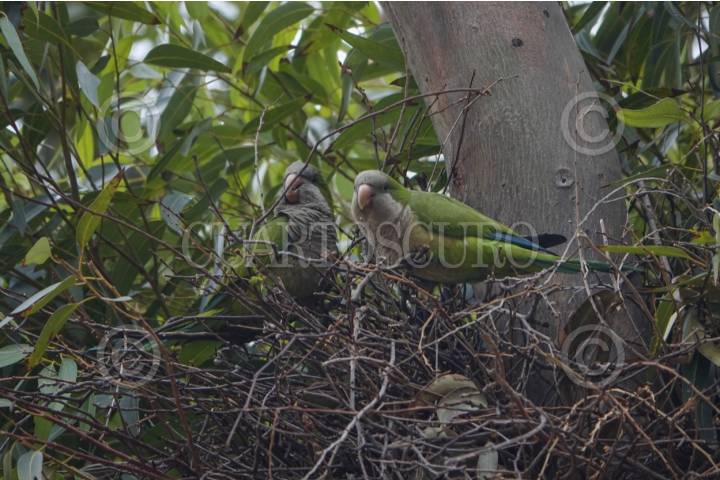 CIUDAD DE MÉXICO, 11MAYO2025.- Perico Monje Argentino también llamada perico monje, cata, catita o cotorra ventigrís, posa sobre su nido en el Bosque de San Juan de Aragón. Los pericos monje construyen nidos grandes con ramas en árboles o infraestructura. En algunos lugares, se considera una especie invasora debido a su impacto en la agricultura y las aves nativas. FOTO: MAGDALENA MONTIEL/CUARTOSCURO.COM