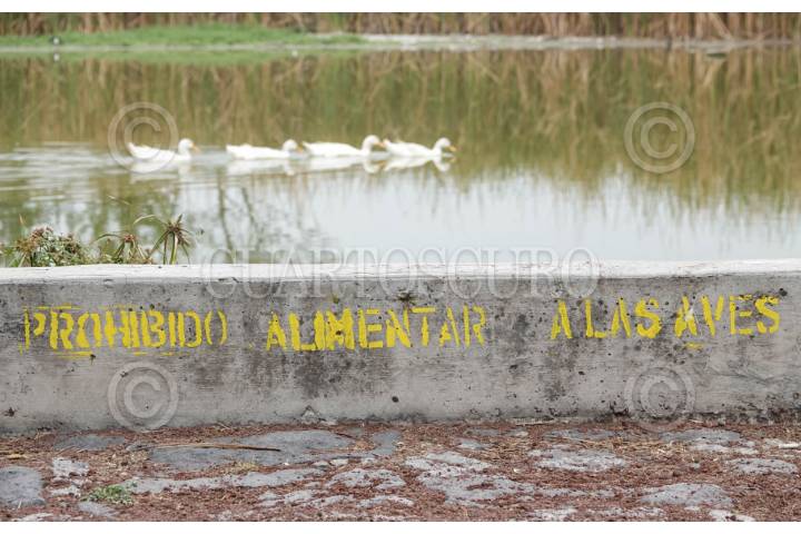 CIUDAD DE MÉXICO, 11MAYO2025.- Sobre la barda que rodea el lago del Bosque de San Juan de Aragón se lee: "prohibido alimentar a las aves", debido a que los visitantes acostumbran a darle pan a los patos, sin embargo el pan deformar sus alas incapacitándolos para poder volar. En el marco del Día Mundial de las Aves Migratorias, la Secretaría del Medio Ambiente (SEDEMA) de la Ciudad de México, a través de la Dirección General del Sistema de Áreas Naturales Protegidas y Áreas de Valor Ambiental (DGSANPAVA) realizó un recorrido guiado para la observación de aves con el objetivo de promover la cultura ambiental y sensibilizar sobre la importancia de las aves como indicadores de la salud de los ecosistemas urbanos. FOTO: MAGDALENA MONTIEL/CUARTOSCURO.COM