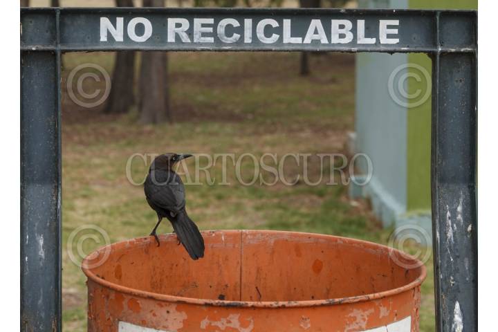 CIUDAD DE MÉXICO, 11MAYO2025.- Zanate Mayor posa sobre un bote de basura en el Bosque de Aragón. En el marco del Día Mundial de las Aves Migratorias, la Secretaría del Medio Ambiente (SEDEMA) de la Ciudad de México, a través de la Dirección General del Sistema de Áreas Naturales Protegidas y Áreas de Valor Ambiental (DGSANPAVA) realizó un recorrido guiado para la observación de aves con el objetivo de promover la cultura ambiental y sensibilizar sobre la importancia de las aves como indicadores de la salud de los ecosistemas urbanos. FOTO: MAGDALENA MONTIEL/CUARTOSCURO.COM