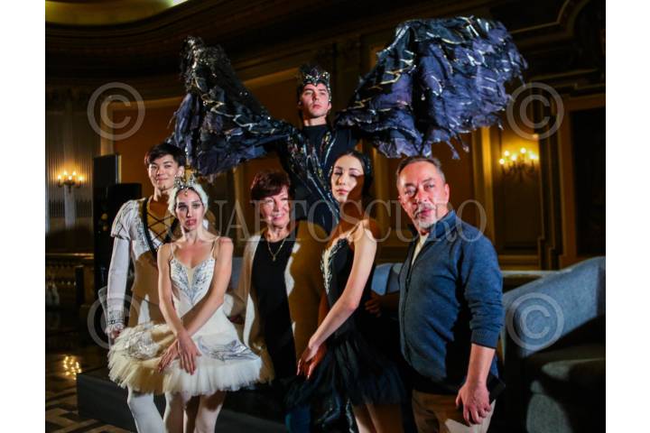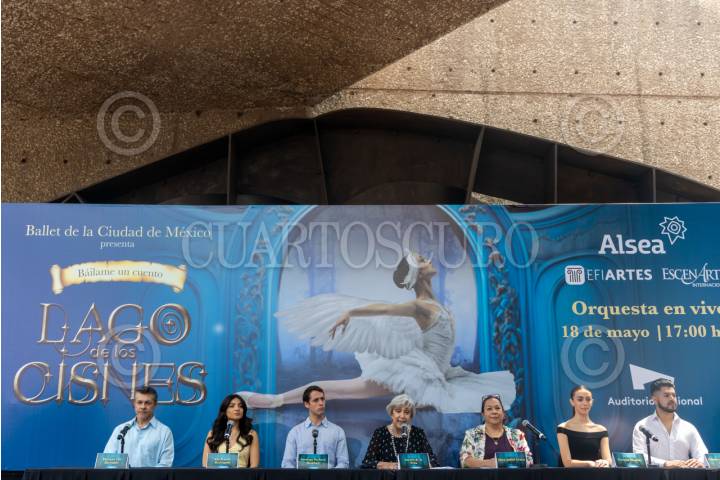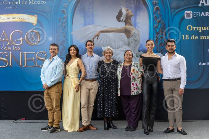 CIUDAD DE MÉXICO, 26MARZO2025.- Enrique Chi, narrador; Ana Karen Rodríguez, bailarina; Santiago Pacheco, bailarín; Arcelia de la Peña, productora y coreógrafa; Isabel Ávalos, directora Artística del Ballet de la Ciudad de México; Natalia Winicki, bailarina, y Christian Barrera, bailarín, durante la presentación de el "Lago de los Cines", este clásico mundial de ballet será presentado en una única función el 18 de Mayo en el Auditoria Nacional. La productora señala que este montaje busca acerca al ballet a otros públicos, ya que en esta ocasión contará con la voz de un narrador quien contará la trama de esta obra original de Tchaikovsky. FOTO: MOISÉS PABLO/CUARTOSCURO.COM