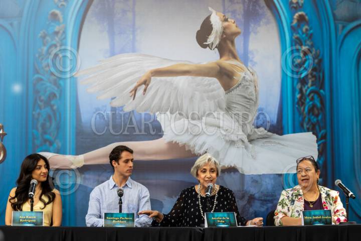 CIUDAD DE MÉXICO, 26MARZO2025.- Ana Karen Rodríguez, bailarina; Santiago Pacheco, bailarín; Arcelia de la Peña, productora y coreógrafa; Isabel Ávalos, directora Artística del Ballet de la Ciudad de México; y Natalia Winicki, bailarina, durante la presentación de el "Lago de los Cines", este clásico mundial de ballet será presentado en una única función el 18 de Mayo en el Auditoria Nacional. La productora señala que este montaje busca acerca al ballet a otros públicos, ya que en esta ocasión contará con la voz de un narrador quien contará la trama de esta obra original de Tchaikovsky. FOTO: MOISÉS PABLO/CUARTOSCURO.COM