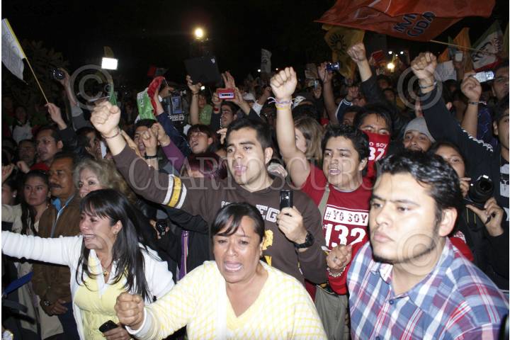 MÉXICO, D.F., 01JULIO2012.- Seguidores del candidato del Movimiento Progresista Andrés Manuel López Obrador, se dieron cita en el hotel en donde el tasbasqueño ofreció una conferencia de prensa en la cual anunció que no fijará postura antes de conocer el conteo final de las elecciones, el resultado del Programa de Resultados Electorales Preliminares en donde le aventaja el candidato tricolor Enrique Peña Nieto. La gente lloró y grito consignas de apoyo en favor del abanderado de las izquierdas. FOTO: PAULINA LÓPEZ /CUARTOSCURO.COM