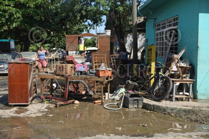 Habitantes de la colonia Gaviotas abren sus casas tras permanecer inundadas por dos semanas de lluvias. En las calles se pueden observar objetos y muebles y dependiendo la zona, un poco de agua.