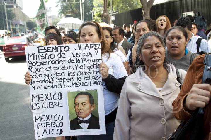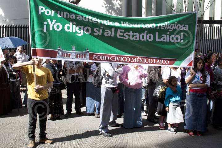 MÉXICO, D.F., 14MARZO2012.- Integrantes de organizaciones laicas realizaron una manifestación afuera de la nueva sede del Senado, donde las comisiones de Puntos Constitucionales y de Estudios Legislativos analizan las reformas a los artículos 24 y 40 de la Constitución. Al interior de la sede senatorial, las comisiones iniciaron el análisis de los cambios al artículo 40 de la Carta Magna, que reafirma el carácter laico del Estado mexicano, para tratar de aprobar el dictamen respectivo. FOTO: MOISÉS PABLO /CUARTOSCURO.COM