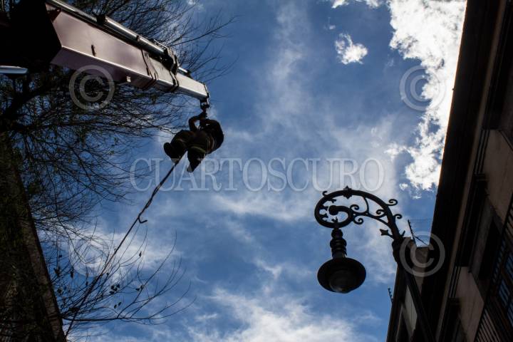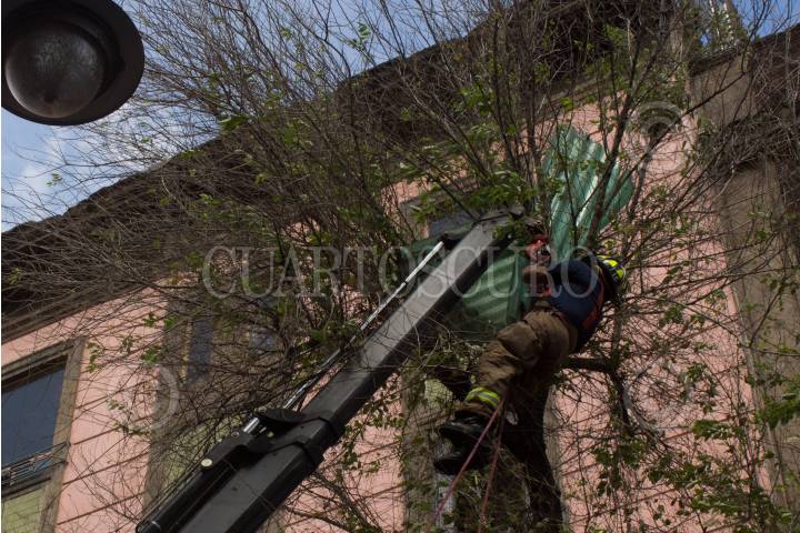 MEXICO, D.F., 14MARZO2015.- En la calle República de Brasil, en el Centro Histórico, el fuerte viento desprendió una lámina del techo de un edificio, quedando esta atorada en las ramas de un árbol. Bomberos realizaron maniobras para retirarla ante el riesgo de que pudiera caer sobre los peatones. FOTO: DAVID POLO /CUARTOSCURO.COM