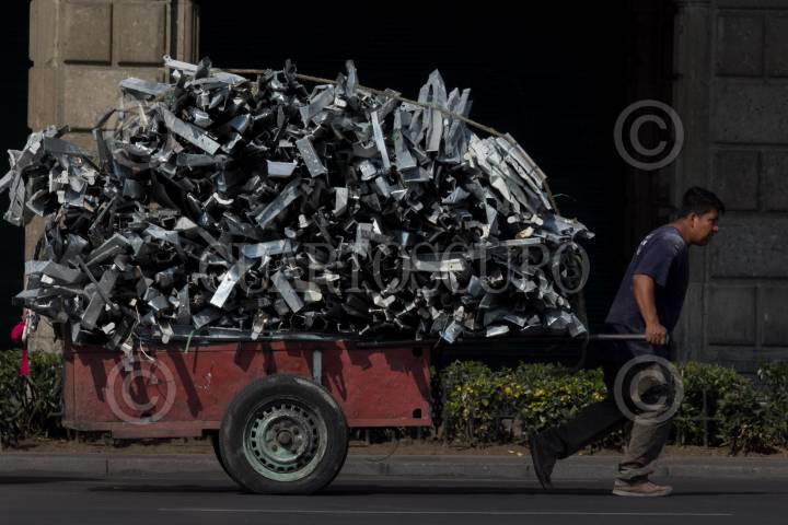 CIUDAD DE MÉXICO, 01MARZO2018.- Quizás para la venta o para botarlos, un hombre carga lámina de aluminio en contra sentido de los carros del circuito Zócalo. FOTO: GALO CAÑAS /CUARTOSCURO.COM