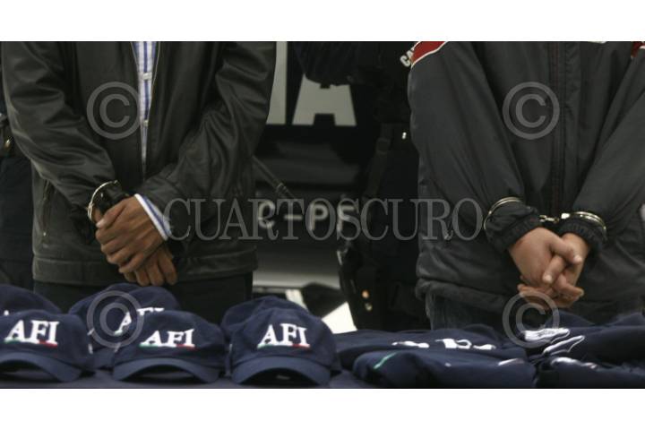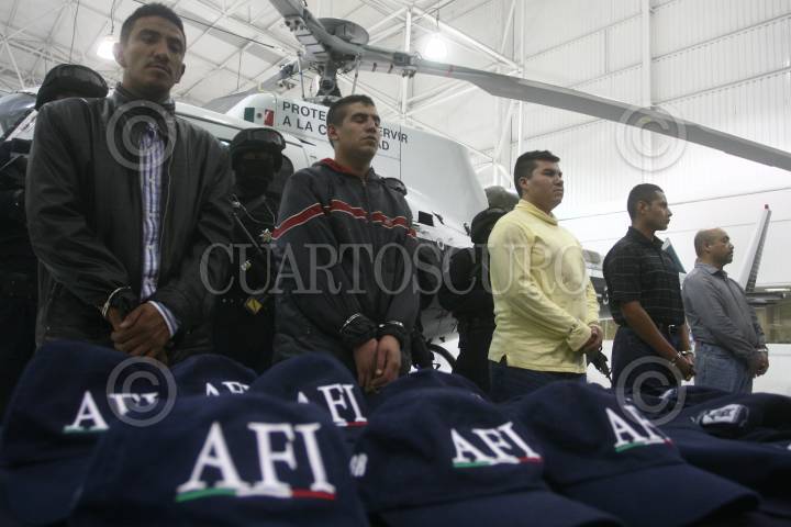 MÉXICO, D.F., 14MAYO2009.- La Policía Federal, presento ante los medios de comunicación a 5 personas detenidas presuntamente vinculadas con la banda de los "Lancheros" que operaban en el estado de Hidalgo y Veracruz, dicha banda criminal se dedicaba al secuestro y se encontraba aparentada con la organización criminal de los Zetas. FOTO: SAÚL LÓPEZ/CUARTOSCURO.COM