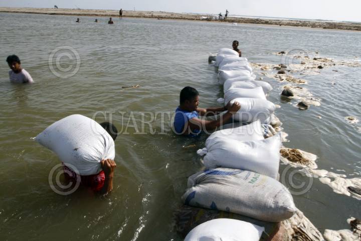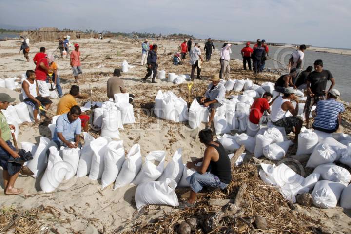 COYUCA DE BENÍTEZ, GUERRERO, 31ENERO2014.- Pescadores provenientes de Cacalutla, municipio de Atoyac de Álvarez, acudieron a ayudar en las tareas del cierre de la barra de la laguna de Coyuca de Benítez a efecto de evitar la sequía que sufre la laguna de Mitla, donde realizan su actividad pesquera. Con un trascabo enviado por el gobierno del estado, los pescadores con palas y costales de arena trabajaron durante todo el día para cerrar el canal que desemboca en el mar. Al cierre de la barra no llegó personal de la Conagua ni de la Semarnat ni la Semaren para supervisar el correcto bloqueo de la salida del agua al mar. FOTO: BERNANDINO HERNÁNDEZ /CUARTOSCURO.COM