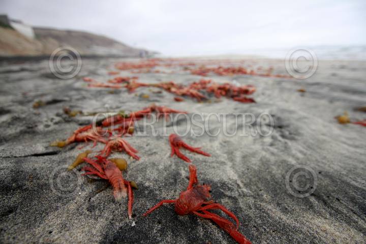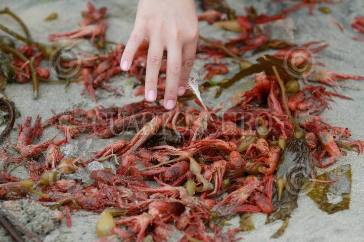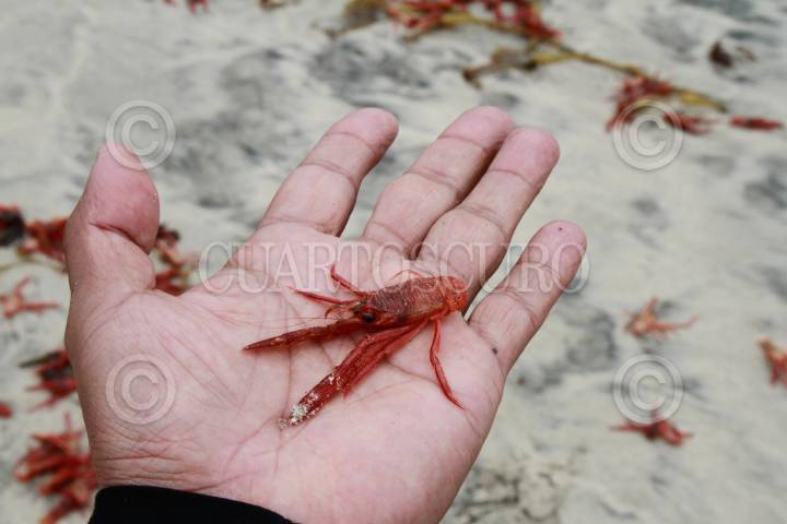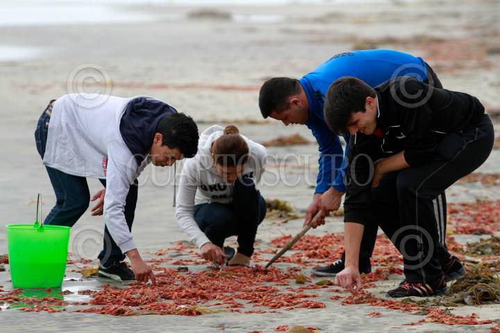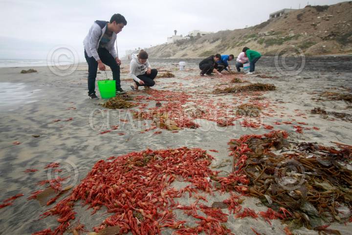 TIJUANA, BAJA CALIFORNIA, 28MAYO2015.- Miles de langostas pequeñas quedaron varadas en Playas de Tijuana, autoridades pidieron apoyo a la ciudadanía para regresarlas al mar. Desde el pasado lunes y hasta este jueves el mar siguió arrojándolas sin que hasta ahora se pueda precisar la causa. La semana pasada miles de medusas velero fueron encontradas muertas en la costa de Tijuana, Ensenada y San Diego. FOTO: CHRISTIAN SERNA /CUARTOSCURO.COM