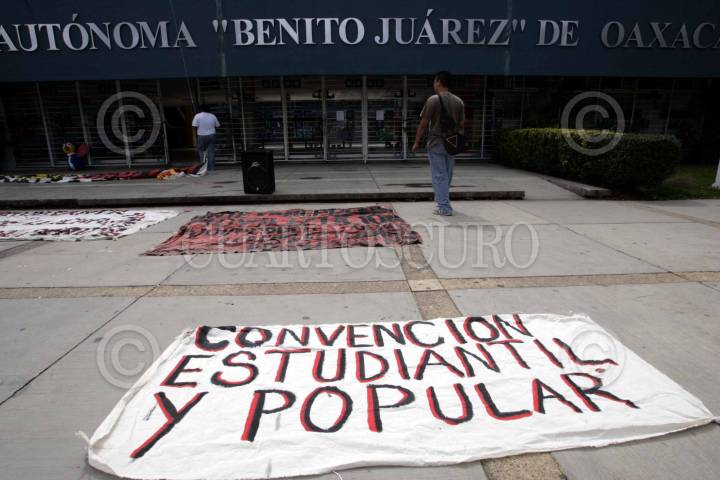 OAXACA, OAXACA 05AGOSTO2008.-El comité estudiantil de alumnos rechazados tomo de nueva cuenta las instalaciones de la máxima casa de estudios donde por un lapso de dos horas colocaron mantas en forma de protesta ante la propuesta del rector Rafael Torres Valdez de rehabilitar solo una cantidad de exámenes de ingreso FOTO: MAX NÚÑEZ/CUARTOSCURO.COM