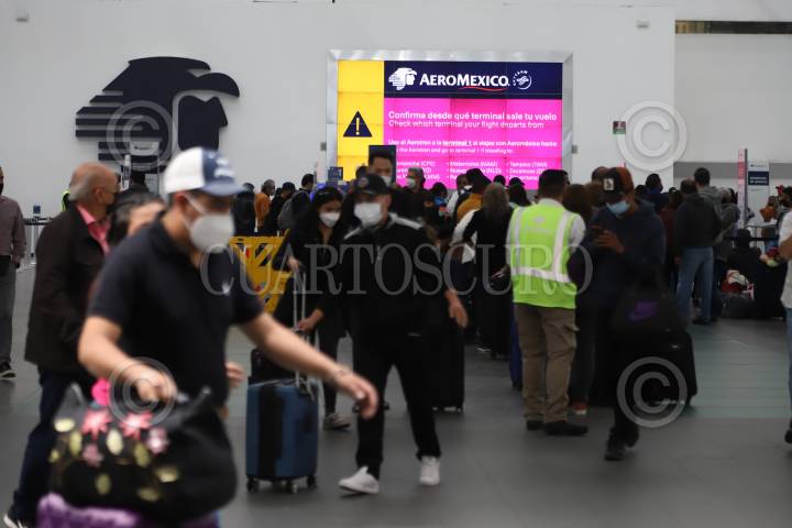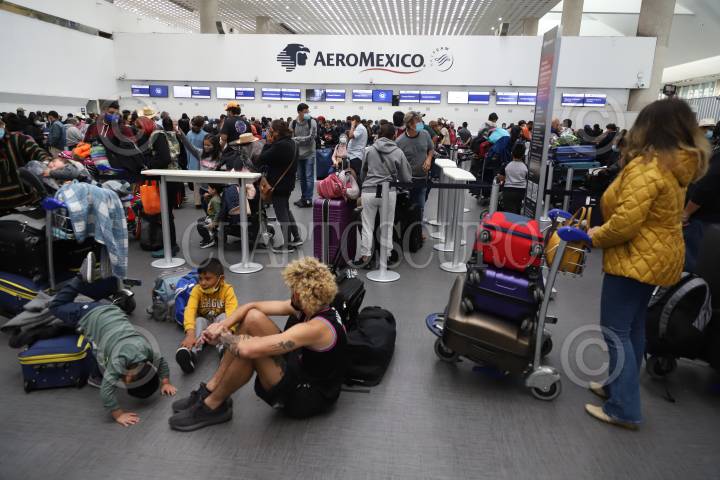Largas filas de espera y saturación en mostradores por parte de pasajeros de la línea aérea Aeroméxico por la cancelación de vuelos que se dio tras confirmarse que 140 trabajadores resultaron contagiados de COVID-19, además de 65 más suspendidos por falta de documentos de vuelo vigentes.
