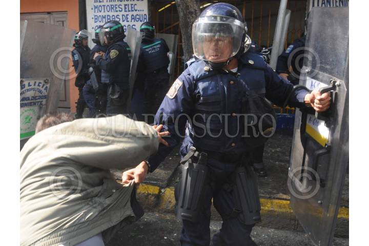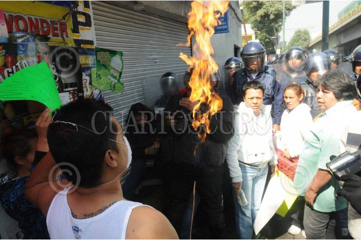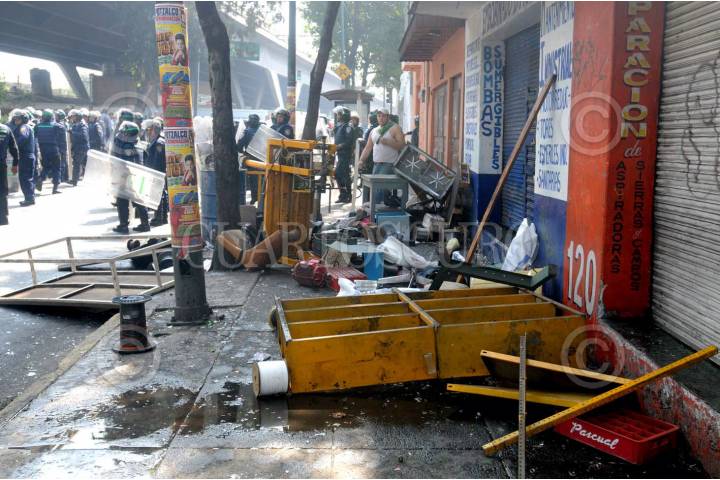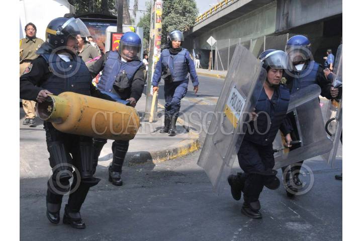 MÉXICO, D.F., 12FEBRERO2009.- Integrantes de la Asamblea de Barrios se oponen a el desalojo ubicado en la lateral de Aquiles Serdan y Rey Maxtla en la colonia Santo Domingo Azcapotzalco lo que origino el enfrentamiento con los granaderos. FOTO: JULIETA MORA/CUARTOSCURO.COM