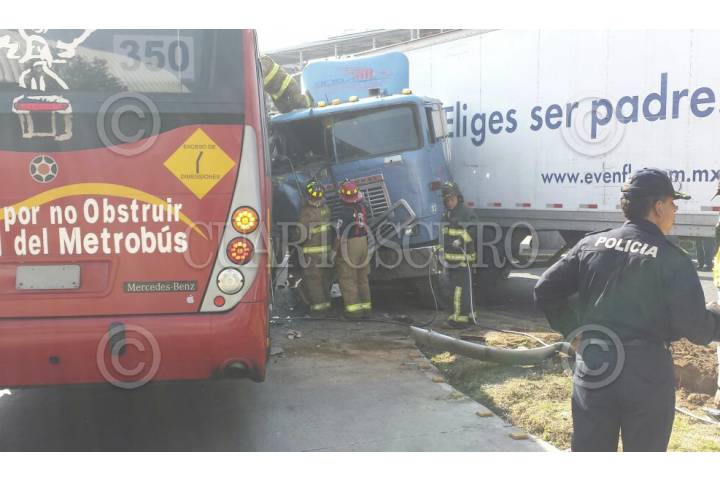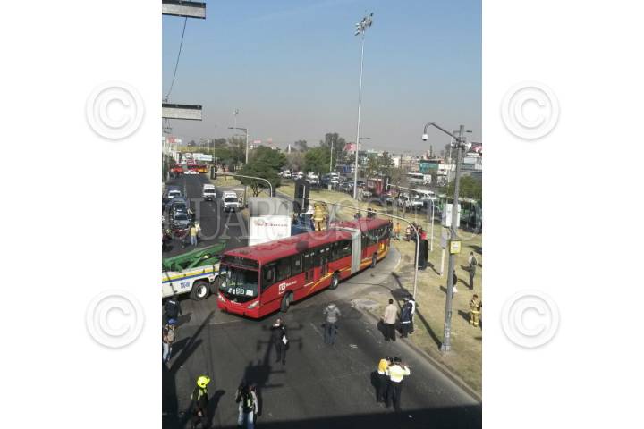 MÉXICO, D.F., 30DICIEMBRE2014.- Cuatro personas resultaron lesionadas luego de que una unidad de la línea 2 del Metrobús chocó contra un tráiler en la lateral de Zaragoza y General León Loyola en la colonia Tepalcates Choque del metrobuús y contra un tráiler esto en la lateral de Zaragoza y General Leon Loyola en la colonia Tepalcates. FOTO: ARMANDO MONROY /CUARTOSCURO.COM