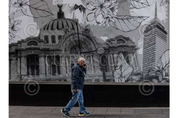 Un señor camina a lado de un póster del Palacio de Bellas Artes y la Torre Latinoamericana.