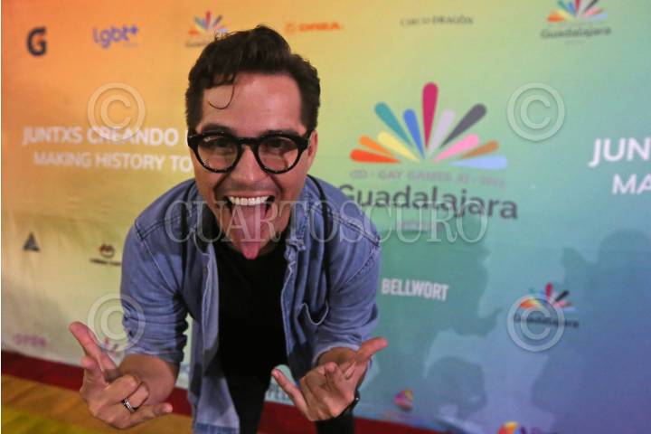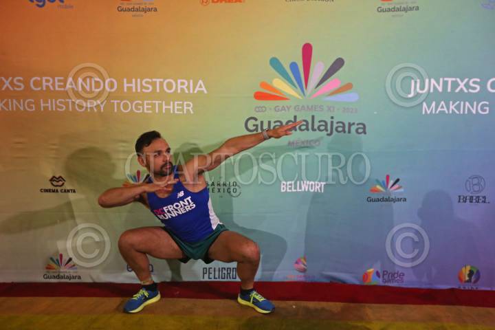 Un joven posa para una fotografía en la Arena Astros, antes de dar inicio el evento donde se dará el anuncio de la cuenta regresiva para los Gay Games, a celebrase en Noviembre del 2023 en Guadalajara.