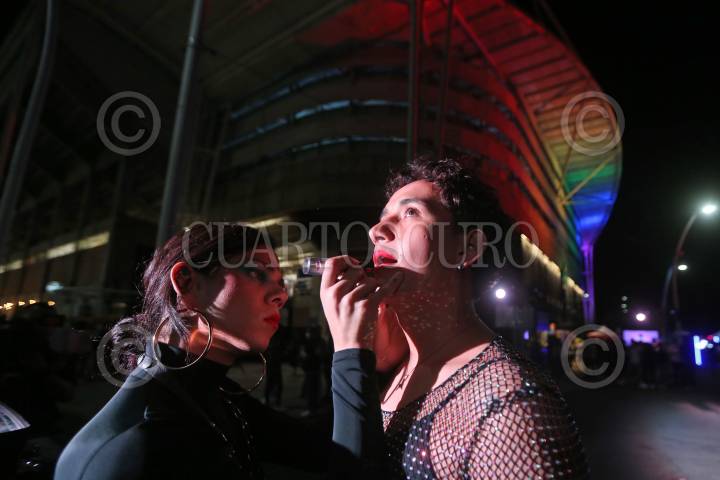 Dos personas de la comunidad LGBTTTIQ+ se maquillan, esto momentos antes de dar inicio el evento donde se dará el anuncio de la cuenta regresiva para los Gay Games, a celebrase en Noviembre del 2023 en Guadalajara.