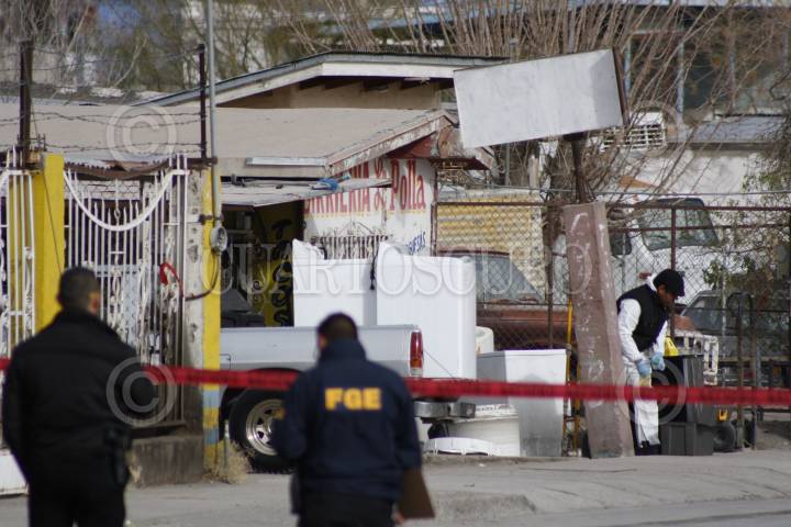 CIUDAD JUÁREZ, CHIHUAHUA, 09ENERO2013.- Un grupo de hombres armados mataron a balazos a un hombre encargado de un negocio de reparación y venta de lavadoras, lo que provocó que en cuestión de minutos agentes de la Policía Municipal realizaran un fuerte operativo de seguridad para tratar de localizar a los responsables. Los hechos sangrientes se registraron en un establecimiento ubicado en calle Centeno y Álamo, a espaldas del fraccionamiento Del Real, a donde arribaron los sicarios y mataron a un hombre de aproximadamente 55 años. En el lugar trascendió que los delincuentes acudieron a cobrar el derecho de piso al hombre fallecido, pero al negarse, comenzaron a dispararle con un arma corta. Unos minutos después, los agentes preventivos comenzaron con un operativo de búsqueda en domicilios, vehículos que circulaban por el lugar y hasta en el interior de camiones de transporte público, pero no se ha reportado la detención de sospechosos. FOTO: NACHO RUÍZ /CUARTOSCURO.COM