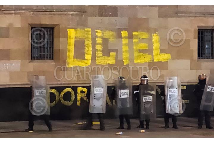 CIUDAD DE MÉXICO, 13NOVIEMBRE2023.- Elementos de la policía custodian la fachada de Palacio Nacional que fue intervenida por integrantes de la comunidad LGBT en protesta por el asesinato de Ociel Baena. FOTO: DANIEL AUGUSTO / CUARTOSCURO.COM