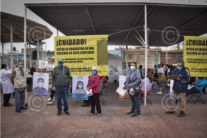 Vecinos de la colonia San Felipe de Jesús Primera y Segunda Sección en la alcaldía Gustavo A. Madero continúan asistiendo a realizarse la prueba PCR para la detección de coronavirus (covid-19) en el "kiosco" de atención ubicado en el camellón de la avenida León de los Aldama.