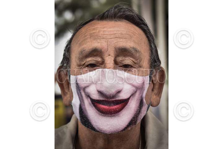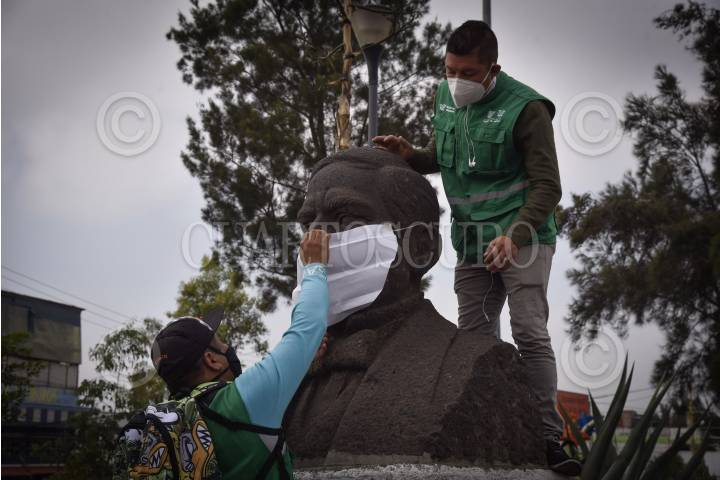Trabajadores de Participación Ciudadana del Gobierno capitalino colocaron cubrebocas de papel al busto de Benito Juárez que se encuentra sobre el camellón de la avenida León de los Aldama como parte de las actividades que realizan brigadas para promover el uso del cubrebocas en la alcaldía Gustavo A. Madero.